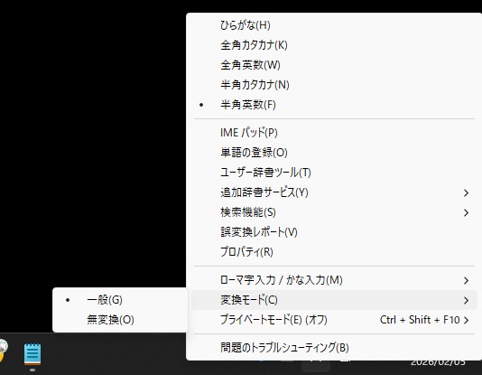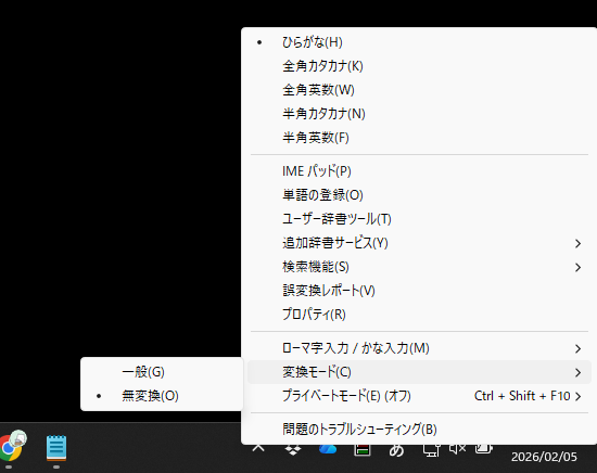 - 対処:タスクバーの「あ」を右クリックし、変換モードを「一般」に戻す。