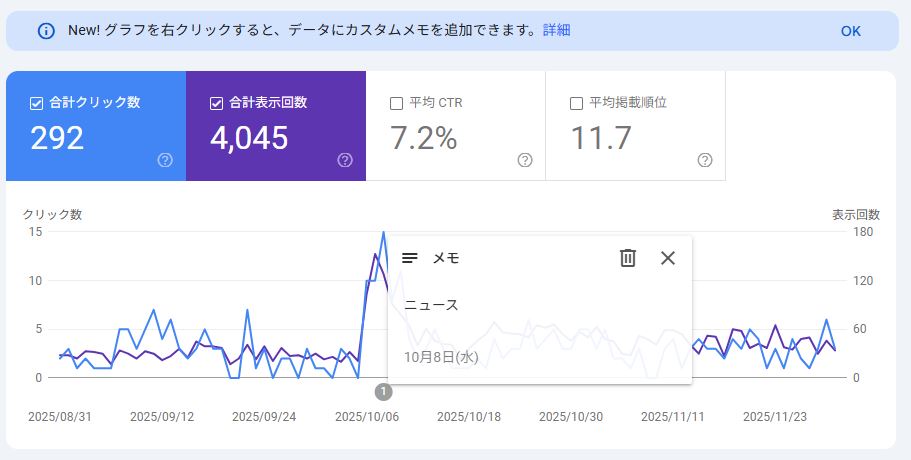 サイト運営の改善施策や不具合対応、記事更新のタイミングなど、あなたが行った“出来事”をチャート上にメモとして残せるようになり、後からデータの変化と紐づけて確認できるようになります。